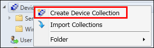 Under \Assets and Compliance\Overview\Device Collections\ Right click on Device Collections and Select Create Device Collection
