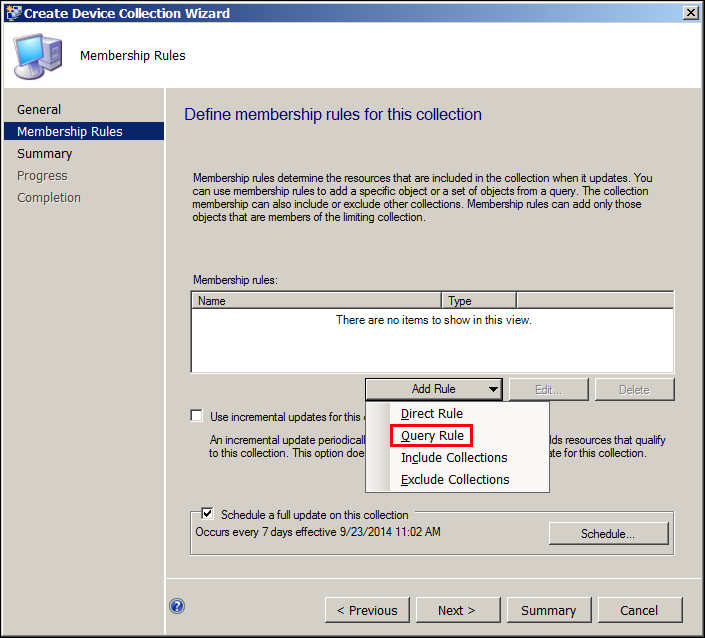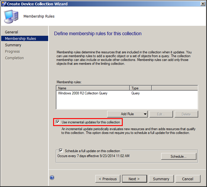 Click OK till you reach the main wizard page and Select “Use incremental updates for this collection” and complete the wizard by clicking Next.