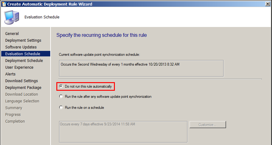 On schedule page, in the case of updates deployment to server I have selected “Do not run this rule automatically”