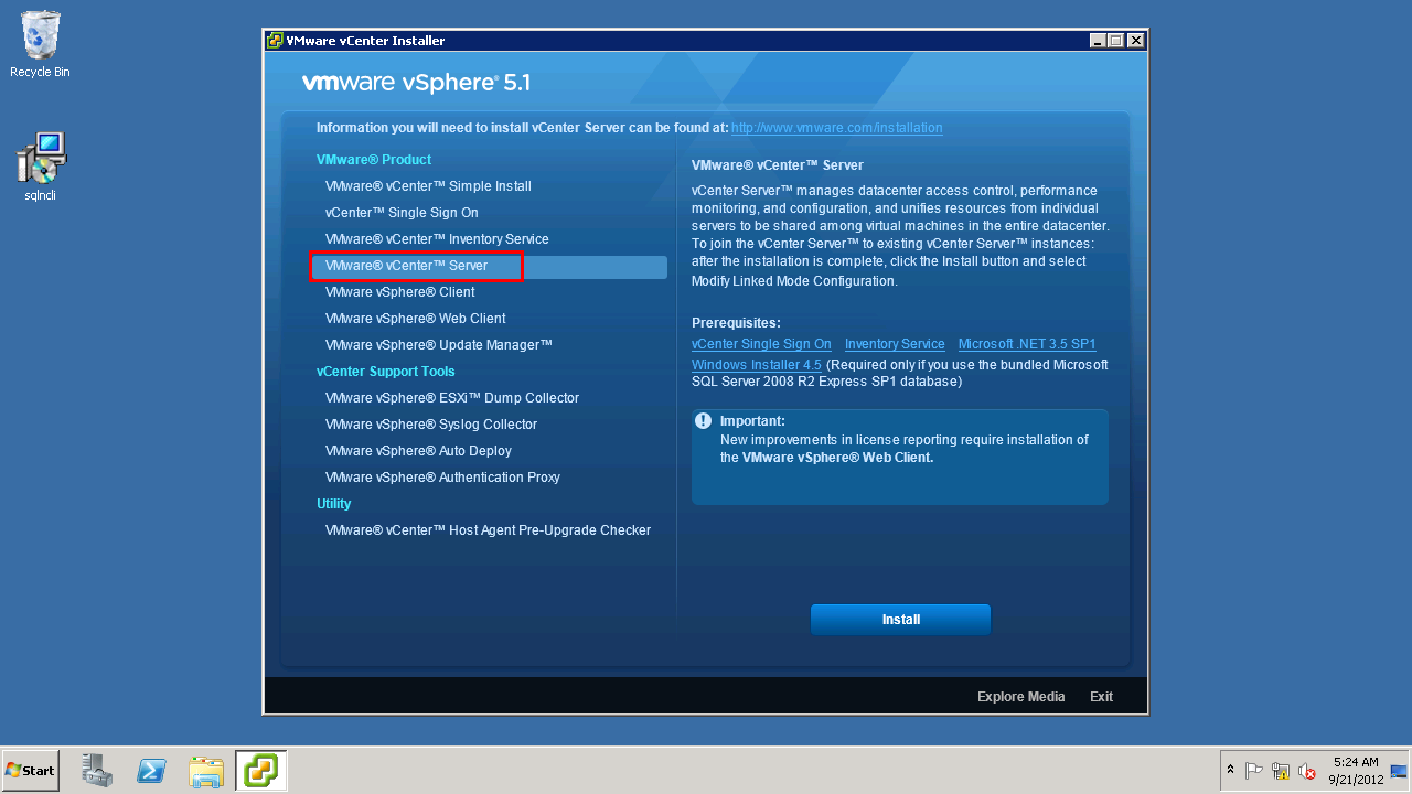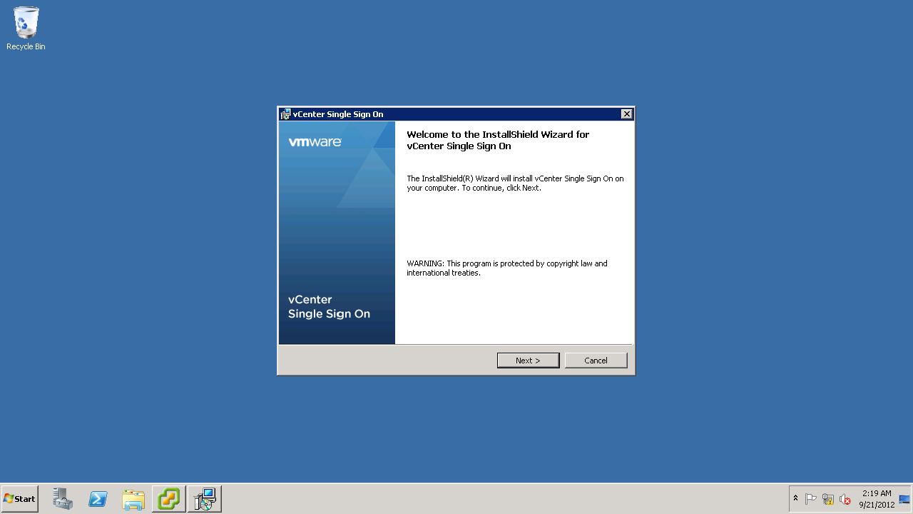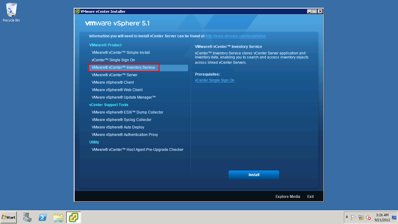 vCenter 5.1 requires vmware Single Sign On and vmware Inventory service, so we will start with Single Sign On service.