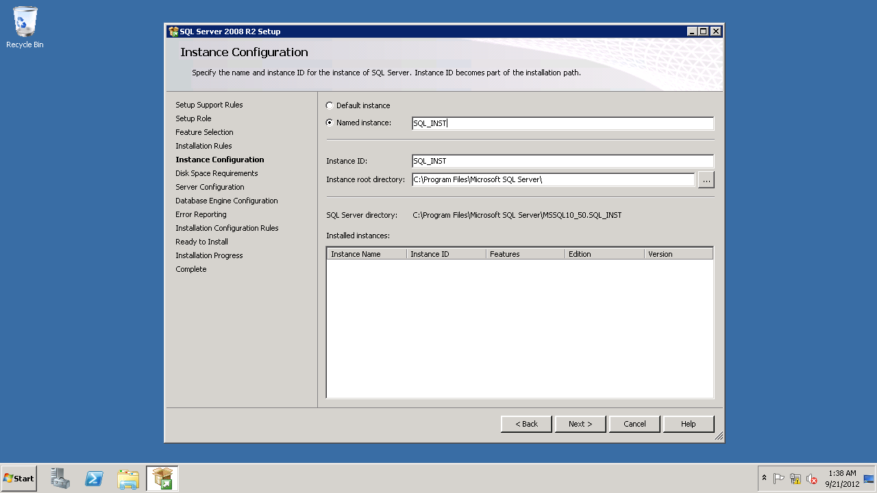 Changed the SQL Instance name from default to custom “SQL_INST”